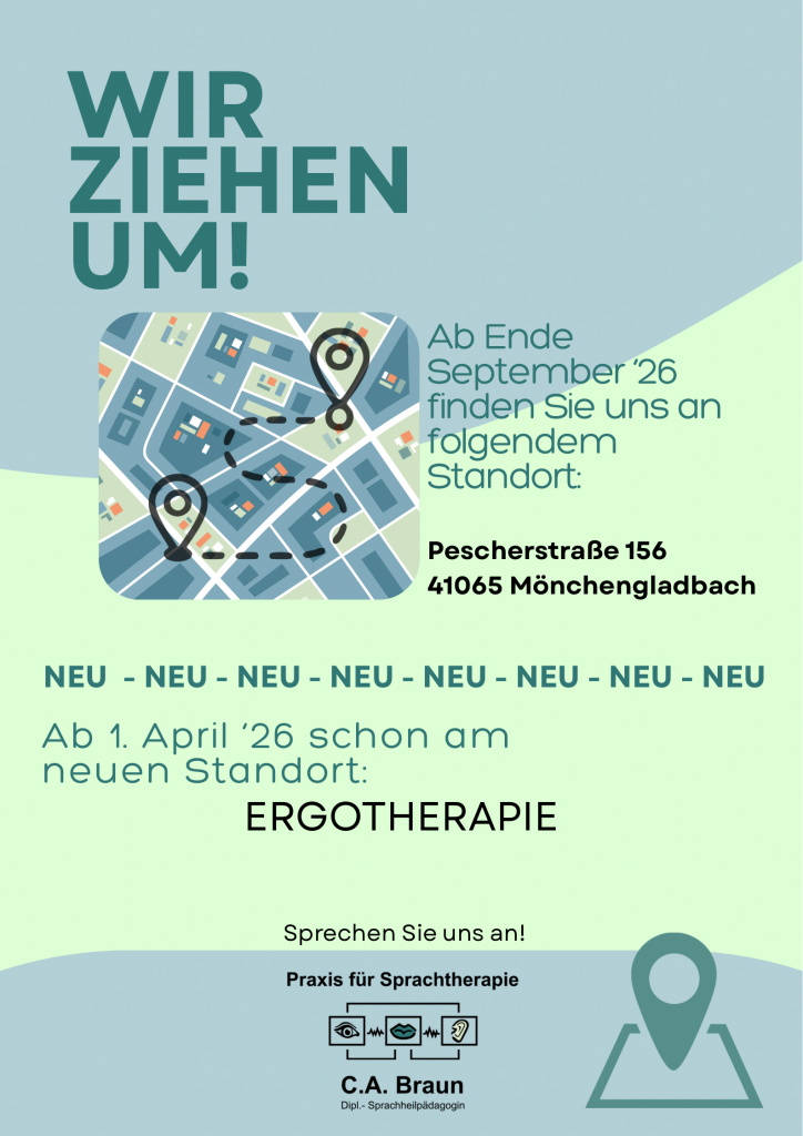 Spannende Neuigkeiten aus der Praxis für Sprachtherapie C. A. Braun! Wir freuen uns, Ihnen mitteilen zu können, dass wir unser therapeutisches Angebot massiv erweitern und in neue, moderne Räumlichkeiten umziehen. Hier finden Sie alle wichtigen Details zu den Standorten und Terminen: